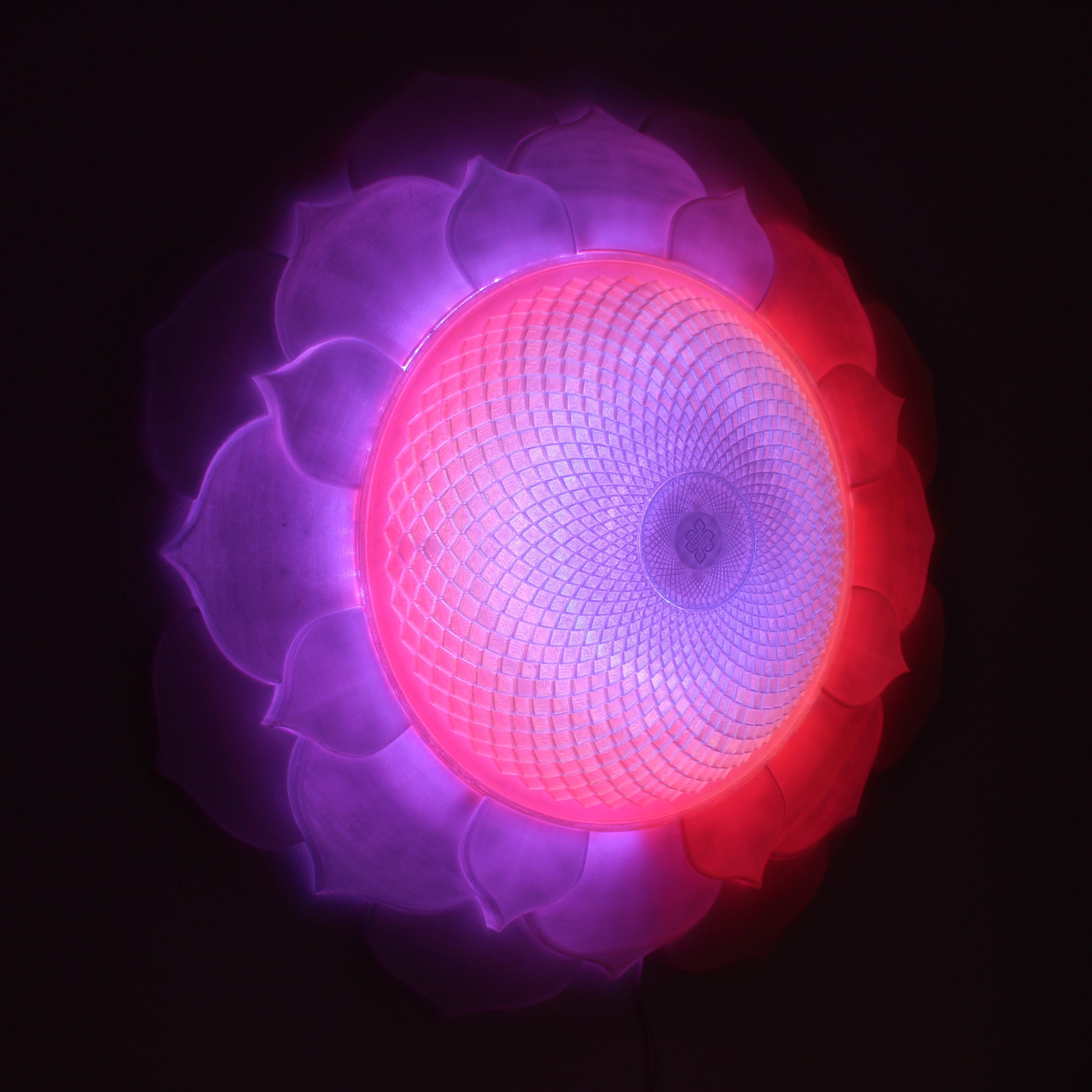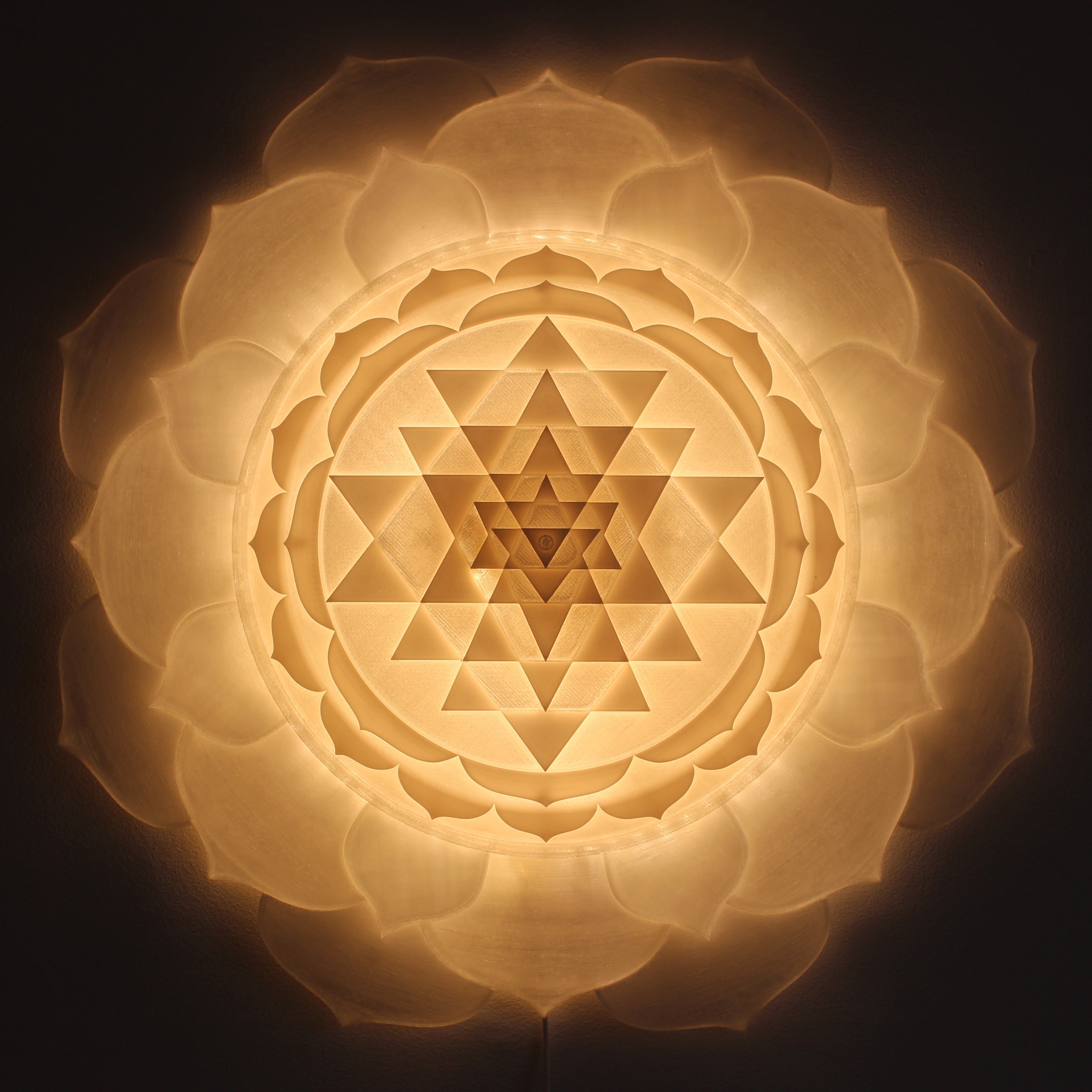 Ananda.One's 1000 Petal Crown Chakra light sculpture is a 65-cm statement piece designed to be the centre of attention in your meditation, retreat, yoga or spa space. 1000-petal geometry is based on traditional representation of Sahasrara (Crown) chakra in yoga. By making each row of the petals protrude forward more and more as we move to the centre of the light, this sculpture takes a sphere like shape. This can represent the natural blossoming of the pure consciousness in the awakened Being.